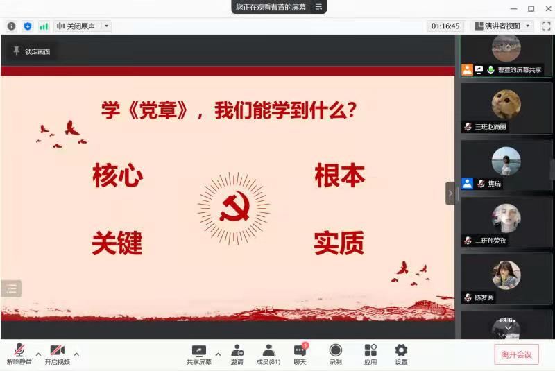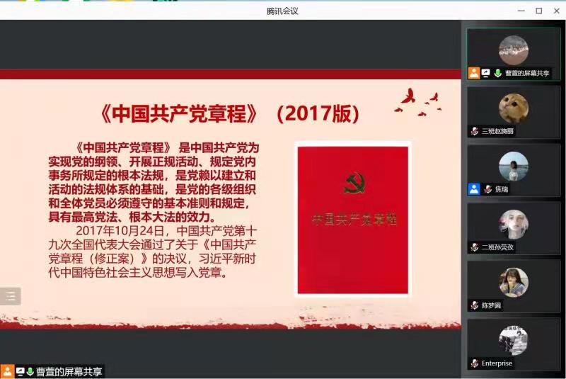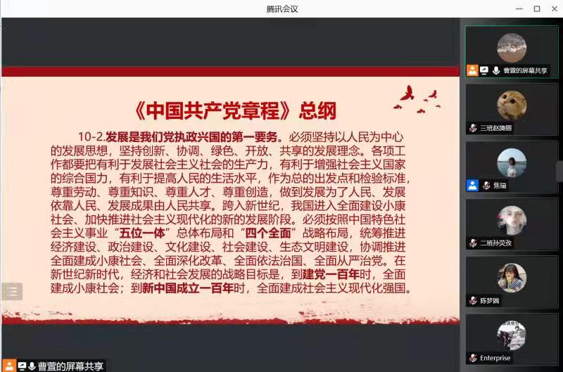 为引导学生自觉向党组织靠拢,端正入党动机,确立为共产主义事业奋斗终身的信念,有效引导学生提高党性修养,牢记党的宗旨,遵守党的纪律,学习党章总纲条文,增强学习党章的自觉性和坚定性,落实党的基本知识学习教育,2021年11月22号下午3时50分,果冻传媒 召开党章学习小组学习会。会议由焦瑞老师主持,党员班主任带领同学们学习,全体新生积极参加。