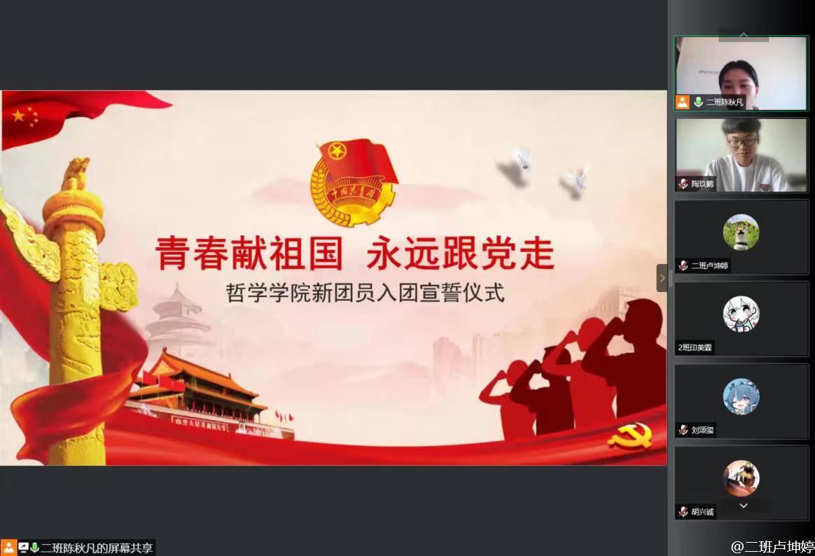 于2022年6月9日下午线上召开新团员入团仪式。本次仪式由21级哲学二班团支书陈秋凡主持,果冻传媒