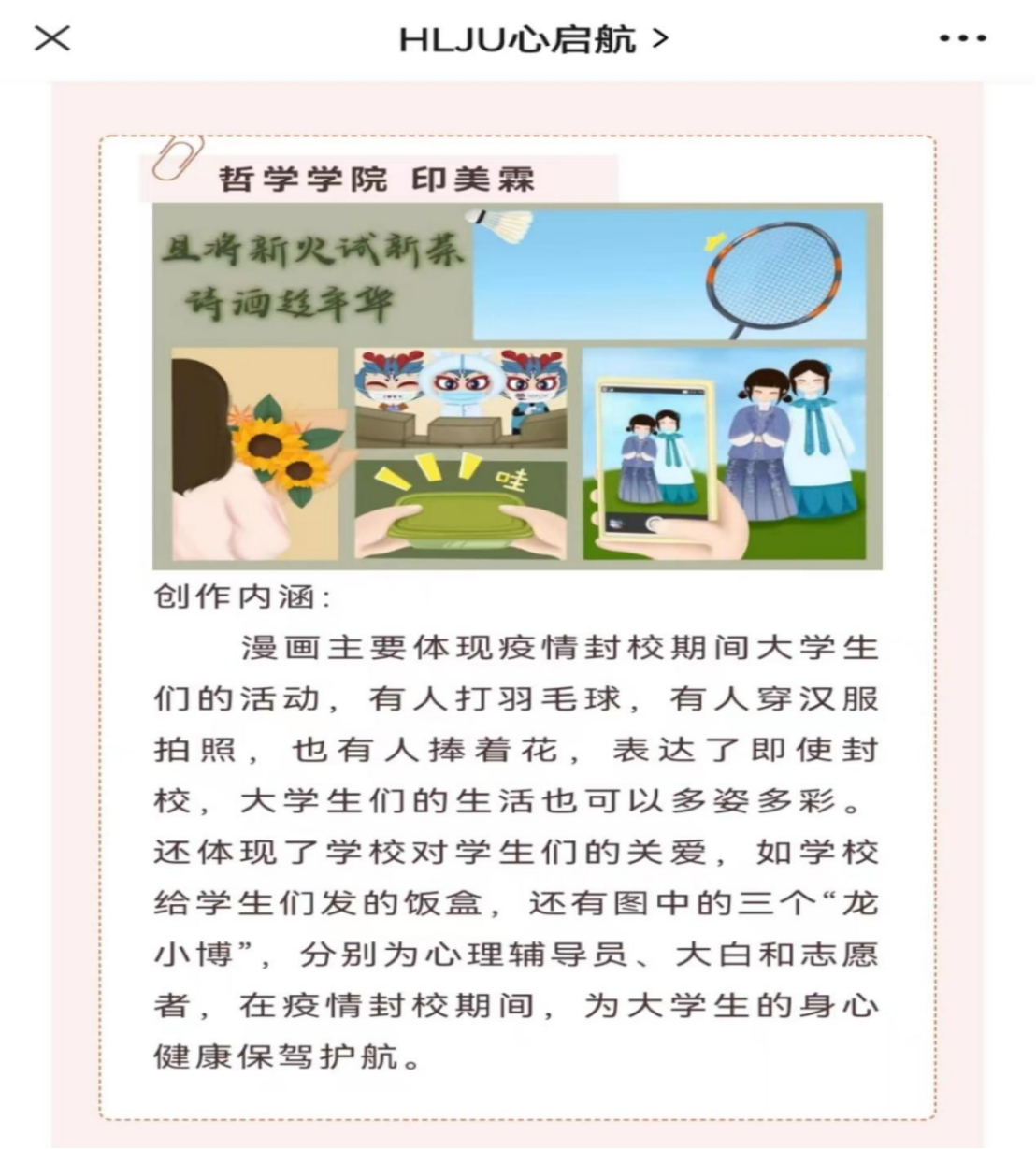 关爱青春,用心发声。为了进一步丰富学生们心理健康知识,更加深入的了解学生的内心世界,了解当代大学生心理健康状况,在丰富同学们课余生活的同时,努力营造一个积极向上的大学生活环境。学生工作部心理健康教育中心开展“关爱青春,用心发声”主题心理漫画作品征集活动。果冻传媒 “哲漾阳光”二级心理辅导站进行大赛作品征集,果冻传媒 印美霖获得“关爱青春,用心发声”心理漫画作品非专业组二等奖。
