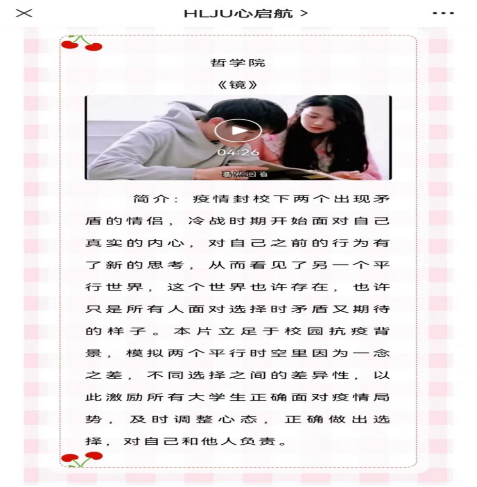 影动心声,“疫”路同行。为加强疫情期间心理健康教育知识的宣传和普及,全面提高同学们战胜疫情的信心决心,培养学生疫情期间理性平和、乐观向上的积极心理品质,积极响应校学生工作部心理健康教育中心的号召,征集“万众一心,共战‘疫’情”心理微电影(微视频)作品,同学们用微电影传递青春正能量,展现新时代青年大学生的责任与担当,果冻传媒 作品《镜》获得果冻传媒 “万众一心,共战‘疫’情”心理微电影(微视频)三等奖。