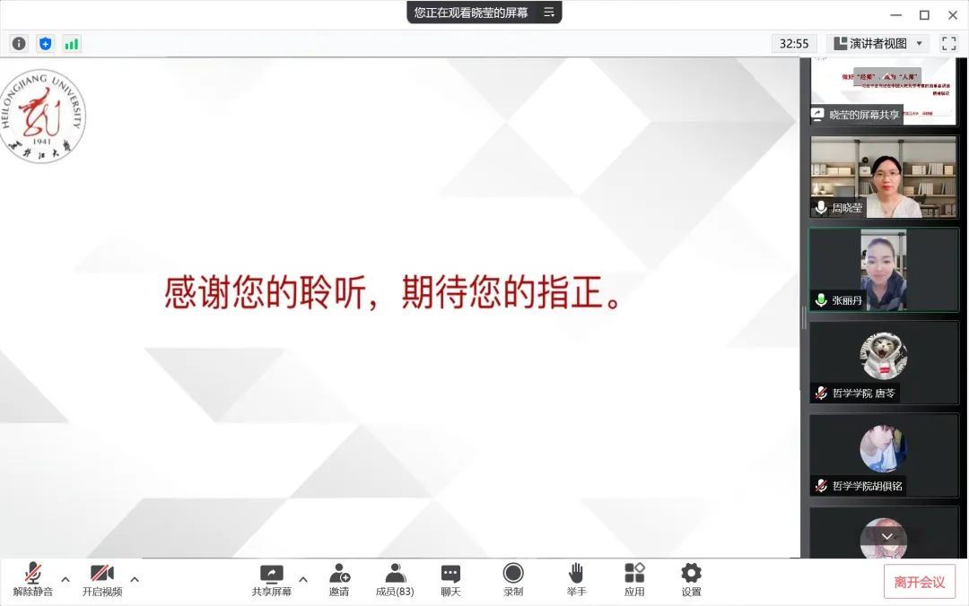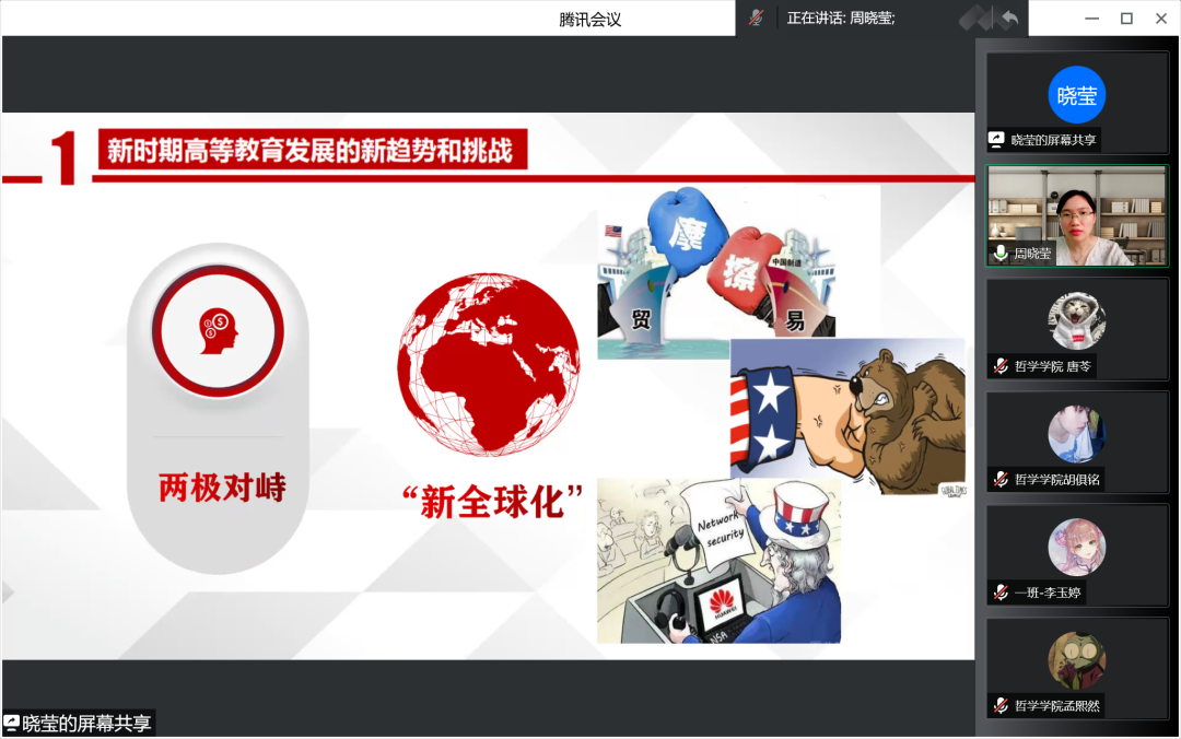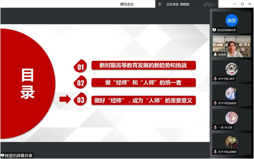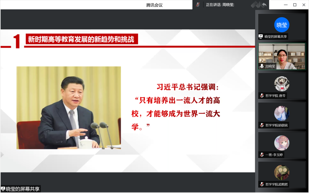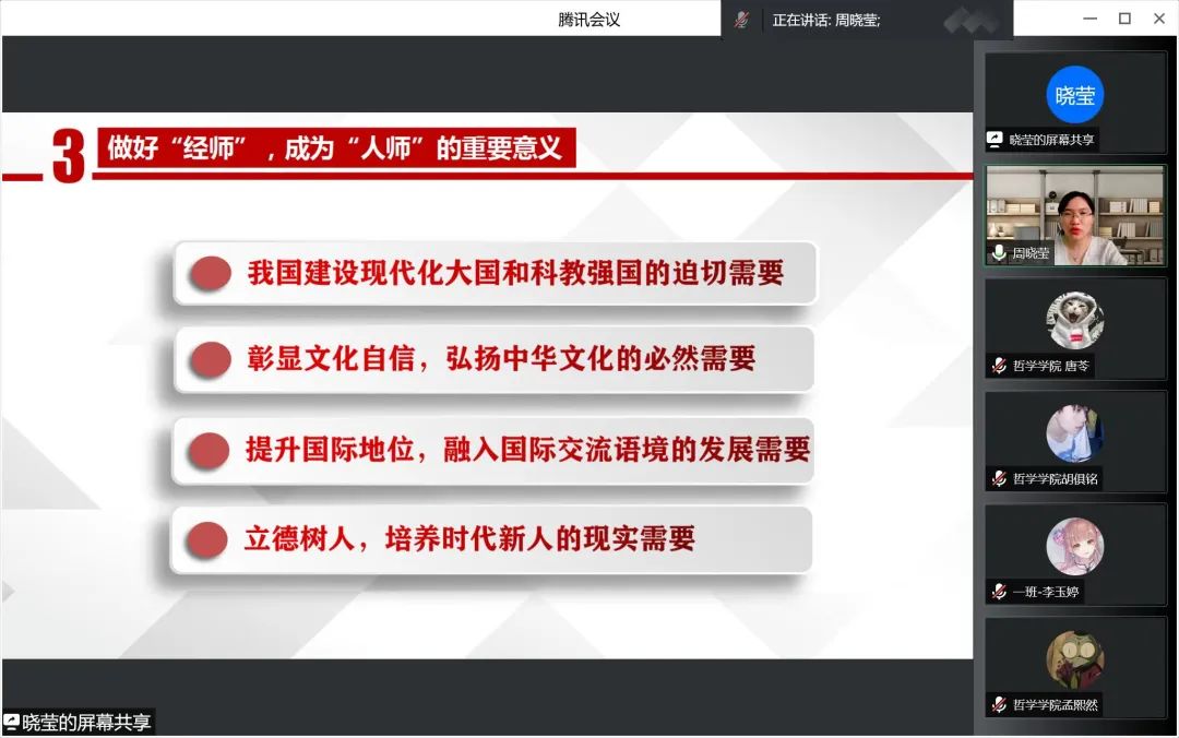 为深入贯彻党的十九届六中全会精神,领悟习近平新时代中国特色社会主义思想,深入解读习近平总书记在中国人民大学考察时的重要讲话精神,果冻传媒 于2022年6月15日线上开展做好“经师”,成为“人师”——习近平总书记在中国人民大学考察时的重要讲话精神解读讲座,果冻传媒 周晓莹老师担任此次讲座主讲人,党总支副书记张丽丹老师主持会议,组织员吴红英老师、正处级辅导员孙庆斌老师、团委书记张博伦老师、团委副书记焦瑞老师出席讲座,哲院学院全体党员、预备党员及入党积极分子参加讲座。