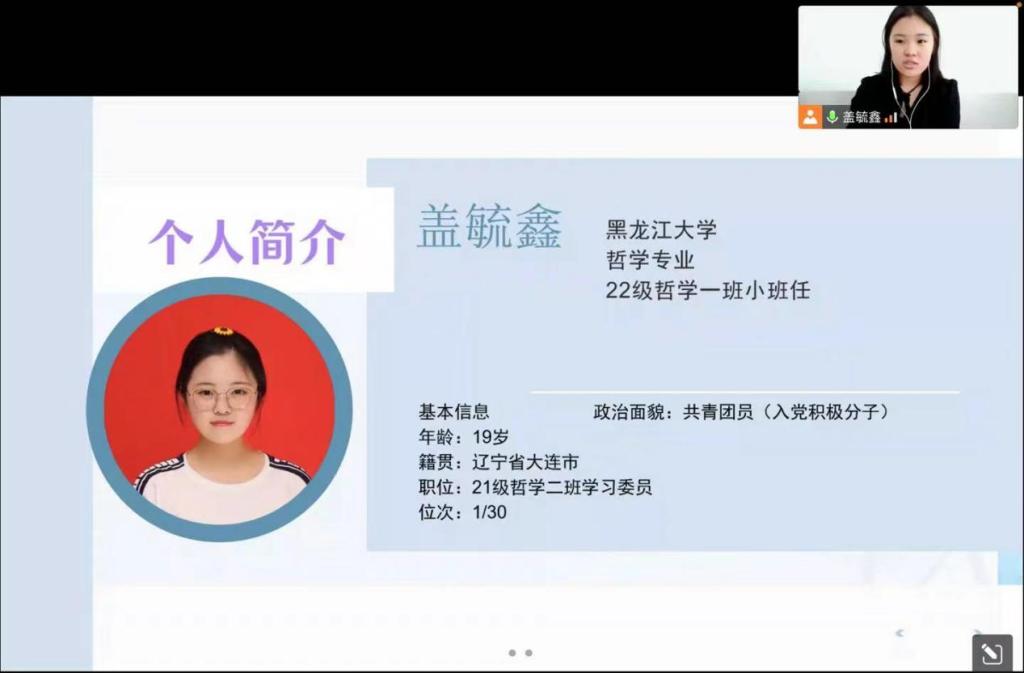 首先,2022级哲学一班的新生班主任盖毓鑫同学进行自我介绍,盖毓鑫同学希望可以和同学们携手共进、乘风破浪、共同进步。如果同学们在学业上或是生活上有困难,也会尽己所能帮助大家。