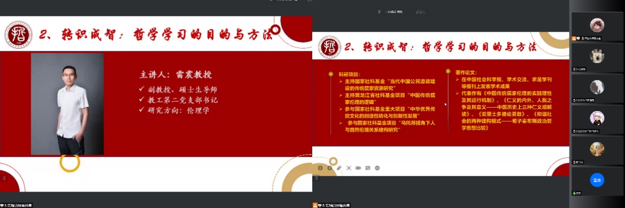 雷震老师以《转识成智:哲学学习的目的与方法》为主题,讲述他对哲学的理解。首先雷震老师欢迎各位同学的到来并提出一些问题:什么是智慧?为何要爱智慧?爱智慧会怎么样?对于这些问题的回答有助于认知哲学专业。智慧源于知识,学习哲学也是要注重基础知识,还要会运用知识。雷震老师也希望同学们能始终对哲学好奇,积极思考,培养问题意识,运用所学知识,结合自身体悟,形成自己的观点和看法,把哲学变成真正的智慧。雷震老师也衷心祝愿各位同学能体悟哲学的智慧。