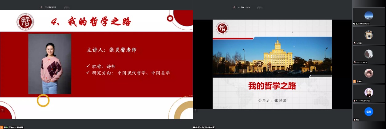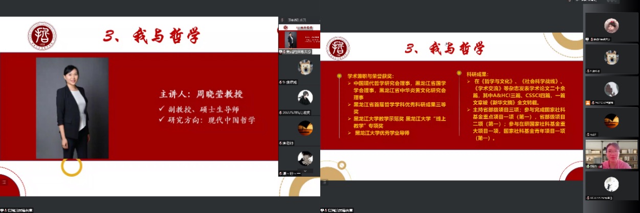 张灵馨老师以《我的哲学之路》为主题,张灵馨老师自己读本硕博的经历。张灵馨老师欢迎各位新鲜血液加入果冻传媒 ,讲述了自己从机缘巧合来到黑大学哲学,面对现实与理想的落差,经过本科阶段的学习,在众多学科中选择了中国哲学后一直走在研究中国美学的路上的求学历程。在进入社会面临众多选择时,张灵馨老师表达了她的择业观,即:不以赚钱为目的,更注重自己能不能继续坚持自己所热爱的研究方向,直面客观上的差距和压力,做出自己的选择。张灵馨老师认为目前全国都在发展建设,城市之间的差距没有那么大,也受到家人想建设家乡的影响,选择留在哈尔滨。