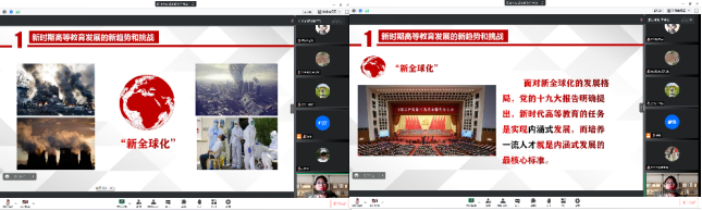 周晓莹老师主讲主题为“担当民族复兴大任,争做时代有为新人—习近平总书记在中国人民大学考察时的重要讲话精神解读”的党课,课程分为两个部分,即“新时期高等教育发展的新趋势和挑战”和“如何担当大任,争做新人”,在周老师的讲解中,我们意识到了新全球化已经到来,我们面临着新的机遇与挑战,面对全球化的发展格局培养一流人才是当务之急。为培养一流人才,教育部强力推进课程思政建设,全面推进新工科、新医科、新农科、新文科建设,面向所有高校所有专业积极实施一流专业建设“双万计划”,取得了显著成果。
