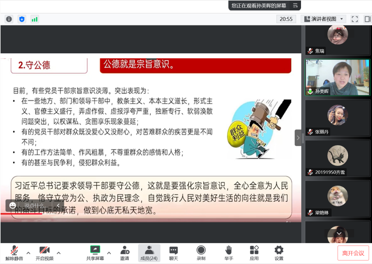 第三方面,培养大学生廉洁自律道德操守。孙书记列举了大学生中的不廉洁现象,比如考试舞弊、论文作假、骗取或恶意拖欠国家助学金和助学贷款、毕业就业缺乏诚信、部分学生干部行为失范等现象,孙书记呼吁学生党员要加强自身廉洁建设、思想建设,作为新时代的高校学生无论何时都一定要时刻严格要求自己。要加强诚信意识、诚实考试,不徇私舞弊。并强调新时代大学生要明大德、守公德、严私德,大德就是理想信念,公德就是宗旨意识,私德就是领导干部的个人操守。