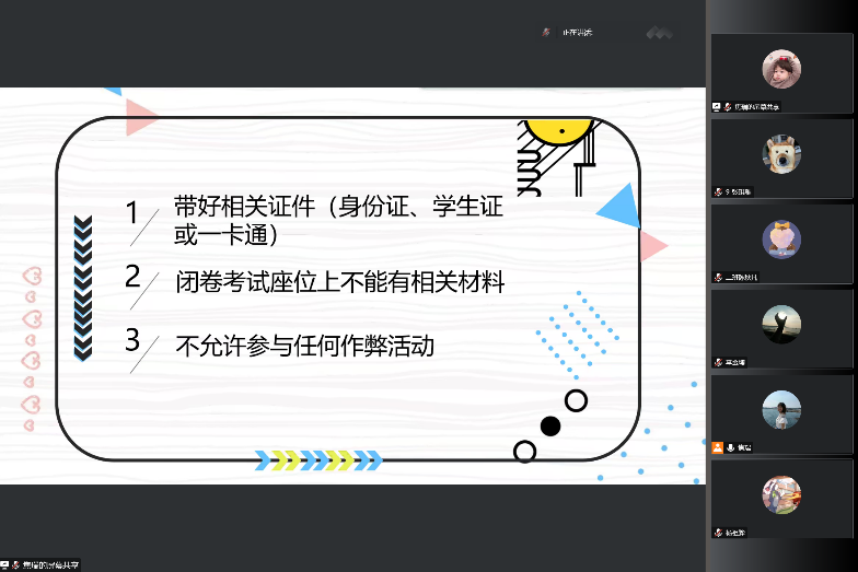 老师带领同学明确线上考试考生须知的各种要求。本学期的考试在线上进行,许多要求需要大家确认和注意。同学们要自觉听从考试工作人员的管理,有困难及时沟通,准备好相关证件,不要迟到。考试周即将来临,老师们希望大家放平心态、合理备考,不要过度焦虑,希望大家都能发挥最佳的状态,取得满意的成绩。