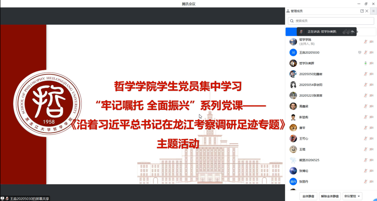 为深入贯彻习近平总书记对东北地区和我省重要讲话重要指示精神,推动学习贯彻习近平新时代中国特色社会主义思想主题教育走深走实。2023年7月31日—8月5日,哲学学院根据学校党委组织部的工作要求,积极动员并着力搭建学习平台,组织学生党员入党积极分子集中学习、教师党员结合个人情况自行学习省委主题教育领导小组办公室制作的《“牢记嘱托 全面振兴”系列党课——沿着习近平总书记在龙江考察调研足迹专题》(第1-6期)。