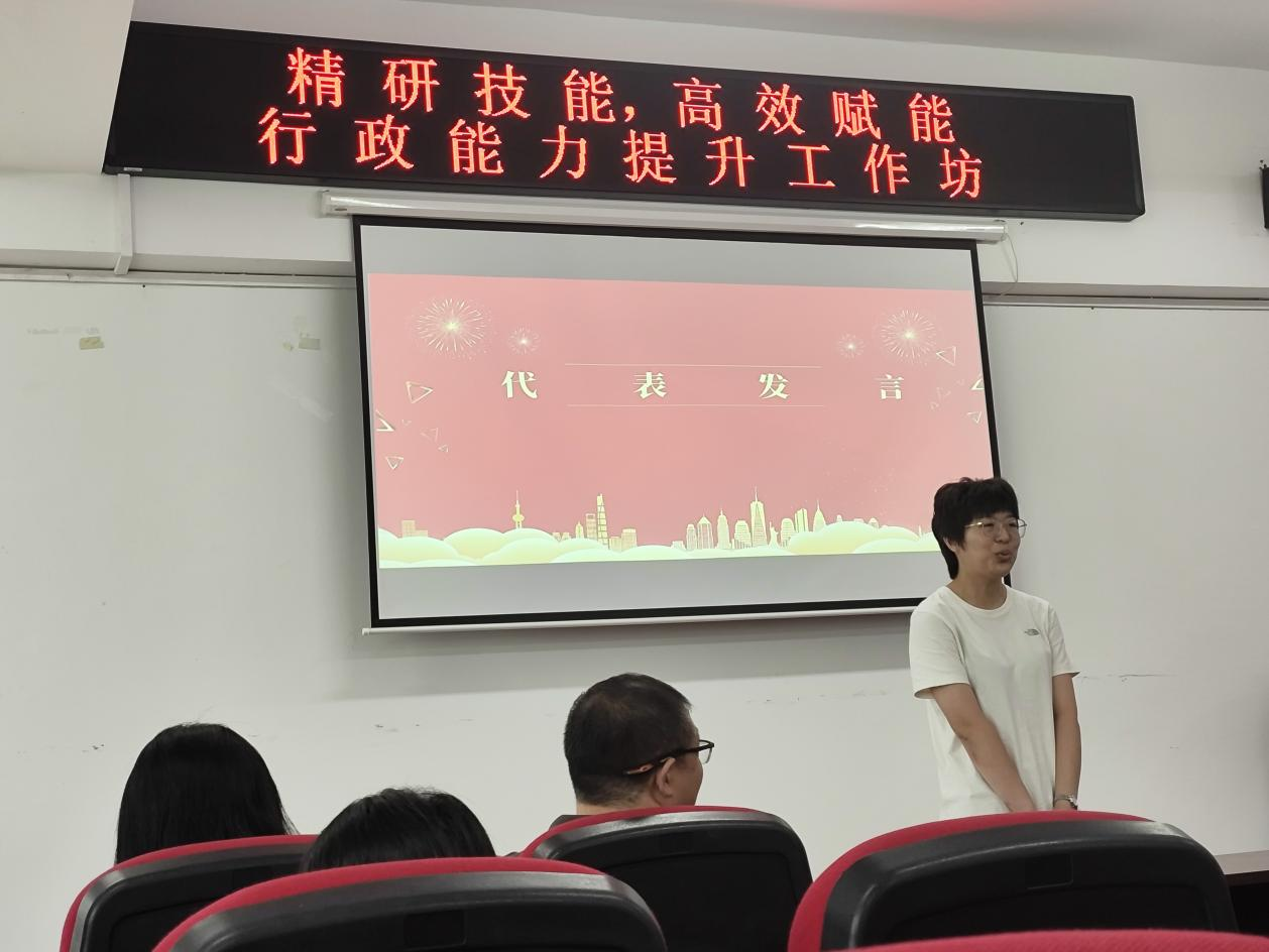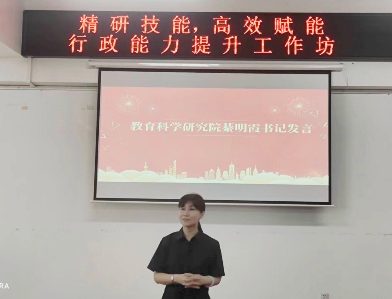 教育科学研究院党总支书记綦明霞为工作坊闭幕式致辞,表示此次联合工作坊内容丰富,通过名师引领和交流研讨,让行政人员突破传统思维的束缚,探索出更具效率的工作流程,相信将有力推动日后工作的高质量发展。(果冻传媒 、政府管理学院、新闻传播学院、教育科学研究院供稿)