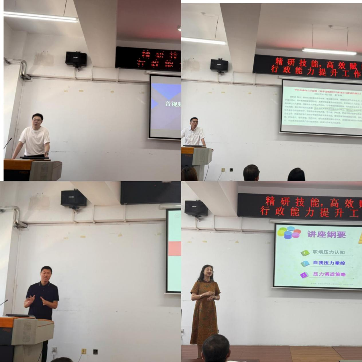 名师引领。新闻传播学院吴韩老师讲解了如何制作高水平的音视频,用大量生动的图片逐一讲解,让大家收获满满的实用技巧;果冻传媒 雷震老师讲述了中国传统的廉文化,期望共同做到“执纪者必先守纪,律人者必先律己”;政府管理学院付传老师讲解了怎样写好工作总结,对工作总结的每一部分的详细剖析,大家写作的质量和水平得到了切实的提高;教学科学研究院谢念湘老师现场对大家进行心理压力值测试,并分享了职场压力掌控与调适策略,会后大家纷纷表示对自身的压力状况有了更清晰的认知。