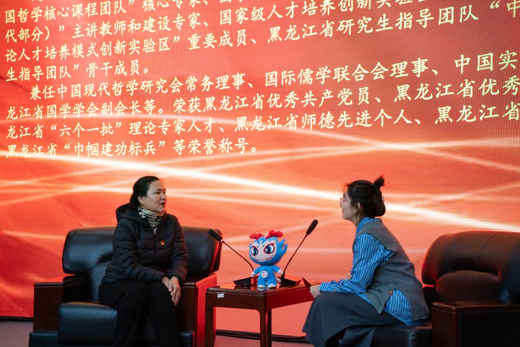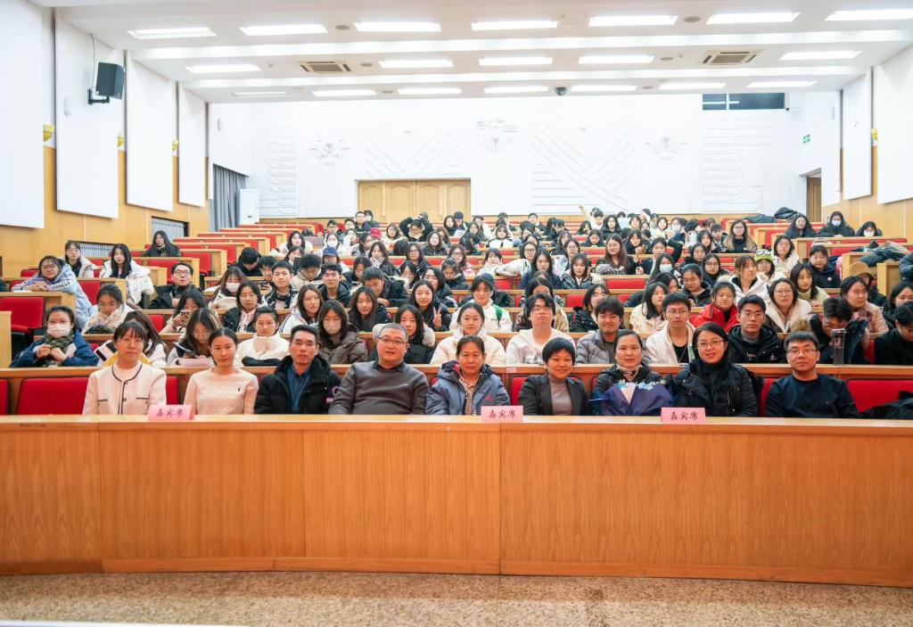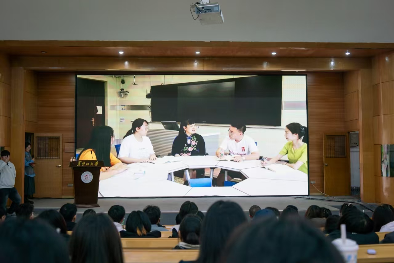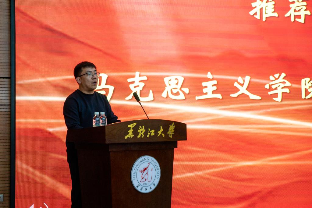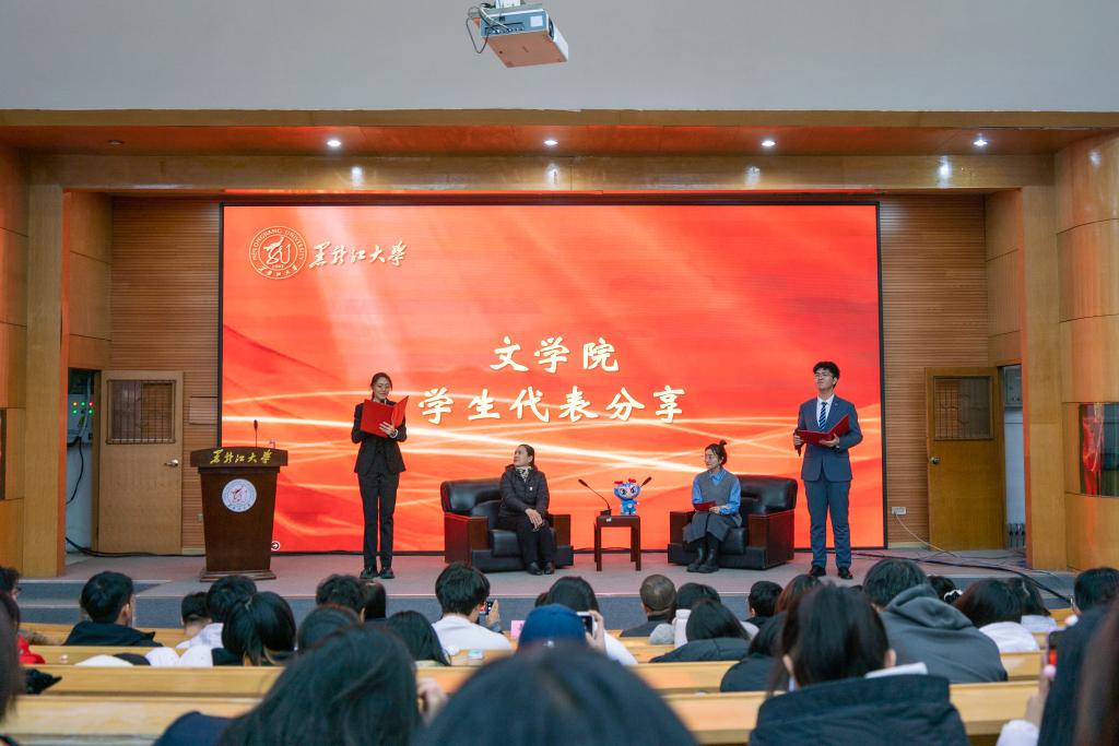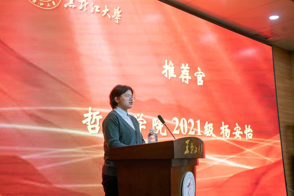 榜样在身边,劳模我推荐。在义霞老师上台之前,全场师生共同观看了“走进黑龙江省劳动模范——魏义霞”宣传视频,大家深深地被魏老师的学术魅力和人格魅力所吸引。马克思主义学院教师李洪杨、哲学学院2021级本科生杨安怡作为推荐官向大家介绍了他们眼中的魏老师。李老师分享了魏老师对他的教诲与启迪,正是在魏老师的影响下走上了中国哲学的求学之路。杨安怡同学向我们分享了魏老师教书育人中所展现的“三牛"精神,魏老师在颈椎病导致右手无法抬起的情况下仍然坚持上课,她不仅关心学生的学业,还始终关注他们的心理健康和成长,以全方位的关爱引导每一位学生成长成才。通过他们与魏老师相处经历的分享,我们看到了一位“潜心科研创新进取”的学者、“勤勉教学作育英才”师者以及 “忘我工作无私奉献”的劳动者。