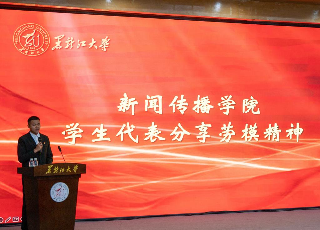 扎根基层,致敬模范。在活动伊始,2022级新闻传播学院的原文龙同学分享了老梁新闻评论班的研学经历,他们走访了位于齐齐哈尔市富拉尔基区的中国一重、大庆油田,近距离的感受了劳模精神、劳动精神和工匠精神通过原同学的分享,同学们了解到了广大劳动群众在一线的坚守与付出