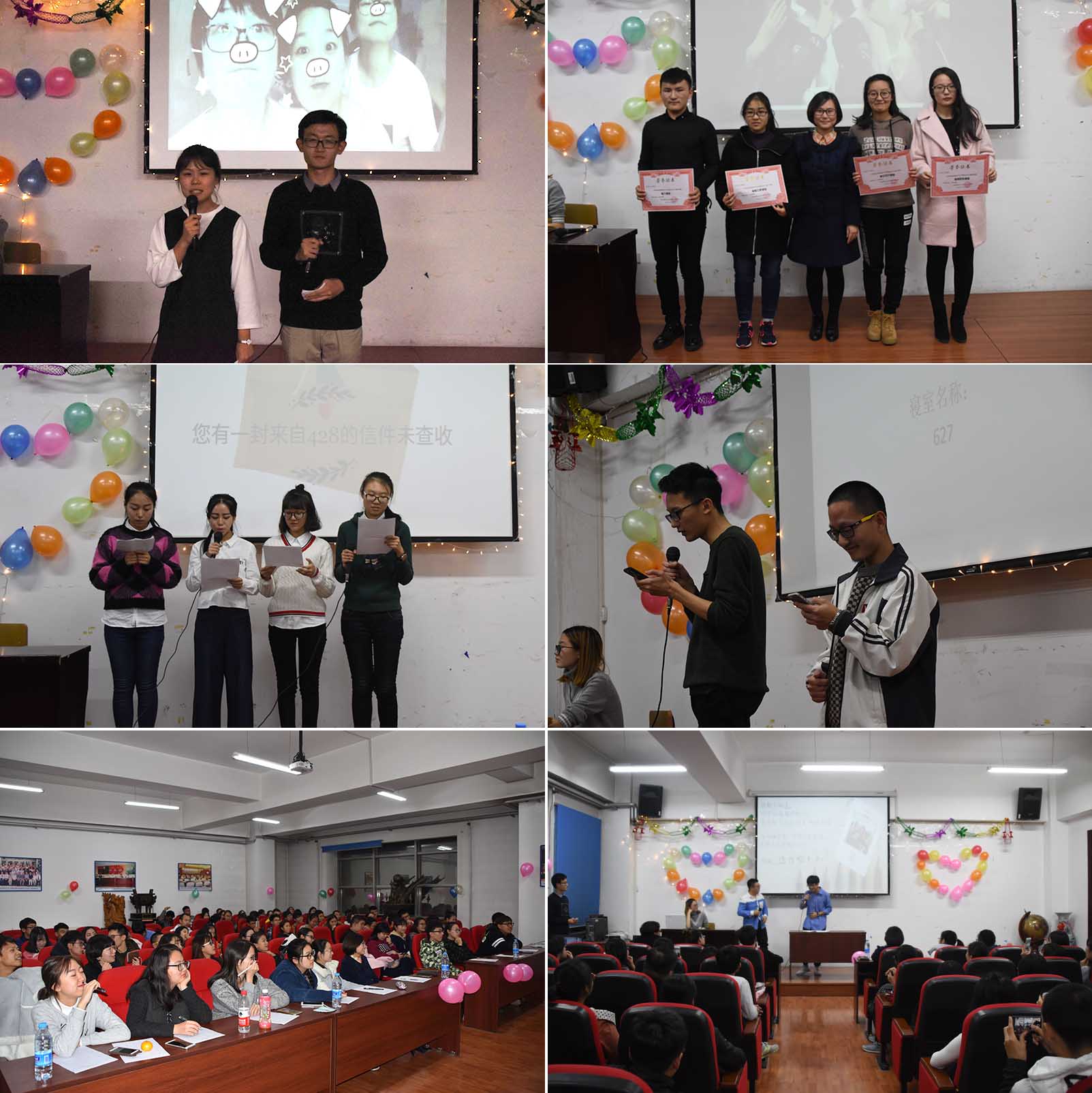 首先,黄老师向大家介绍了本次寝室文化节的举办目的和意义,希望各个寝室的同学们在接下来的环节中团结一心,充分展示寝室风采。接下来,2016级各寝室按抽签顺序依次进行寝室文化的PPT讲解展示,并表演了精彩的节目。同学们创意丰富,每间寝室都别具一格,精彩不断。“方言版”和“改编版”诗朗诵、歌曲演唱、东北脱口秀,舞蹈表演、幽默相声等异彩纷呈,引来同学们阵阵热烈的掌声和欢呼。一首歌曲《老男孩》更是引发了全场的共鸣,将现场气氛推向高潮。最后,黄老师为在寝室文化节中获得荣誉奖项的寝室颁发了奖状并合影留念。在欢乐愉快的气氛中,本次寝室文化节活动顺利结束。