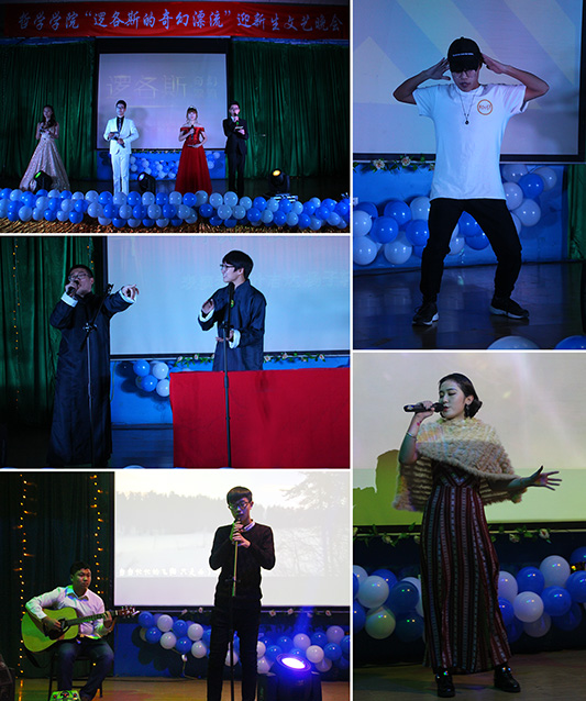 的青春活力,晚会正式揭开序幕。兴安龙江,山高水长。从离开家乡追寻梦想到黑大哲学学学院的不期而遇,因为有你,风雨中我也勇往直前,给我一个吻,融化冰冷温暖我心,让梦想永远坚定。王子齐同学演唱的歌曲《给我一个吻》带动了全场的气氛。紧接着由叶志达、杨子轩同学带来的相声表演引来全场阵阵掌声,迎来晚会第一个小高潮。随后,周晓莹老师为同学们带来的歌曲《你知道我在等你吗》以优美动听的歌声赢得了同学们的阵阵掌声。朗诵《这就是青春》和舞蹈《礼仪之邦》让全场观众屏息欣赏了青春的静默美好与中华传统古代舞蹈的美轮美奂。最后,晚会在果冻传媒