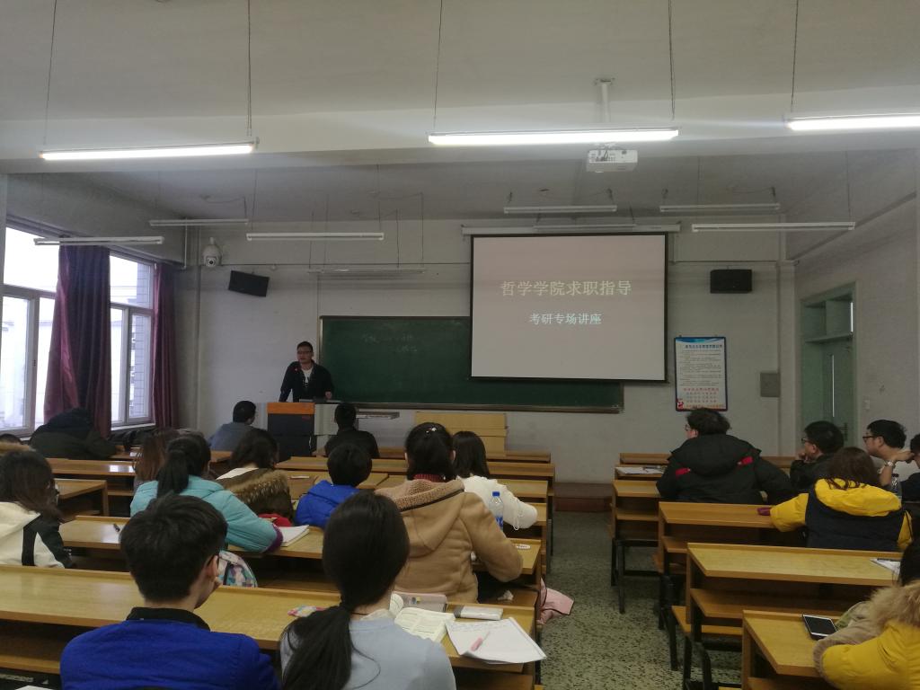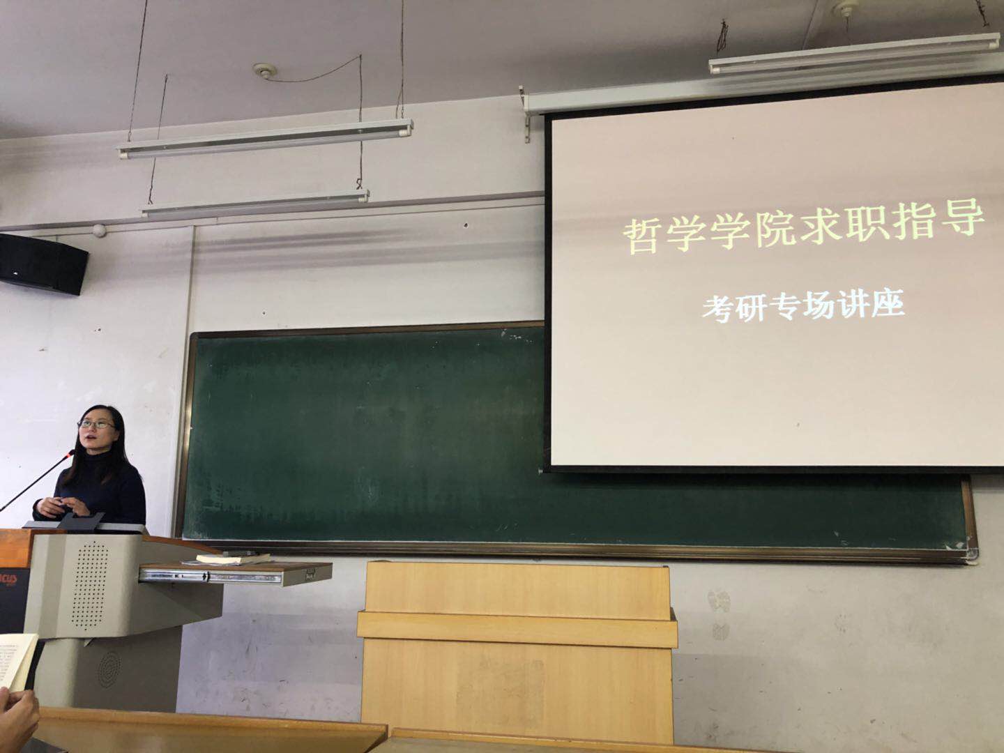 讲座伊始,黄老师以近年来学院毕业生的就业方向作为切入点,向大家介绍了学院历届毕业生的就业情况,说明了哲学专业普遍性考研的现状,积极引导同学们根据自身实际、学习能力、兴趣爱好以及职业规划作出慎重选择,切忌盲目跟风。随后,徐健欣就为什么考研、考研院校及专业选择以及如何备考等三大方面进行了细致的讲解。对英语、政治、专业课的复习进度、复习方法等做了详细介绍。同时,就同学们关心的问题进行了深入交流,并进行了成功经验分享,建议大家多做真题,把握好书目的复习思路,制定好考研计划,秉持信心,坚守恒心,保持专心。