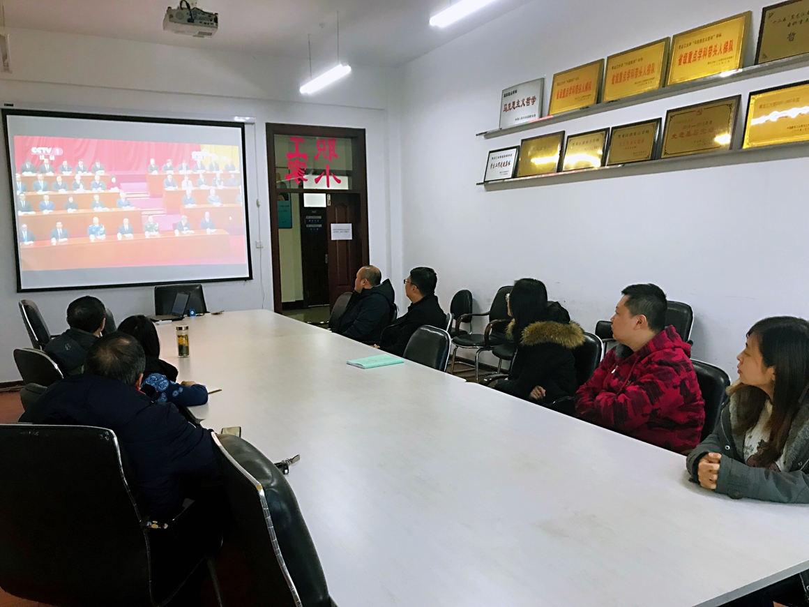 部分教师代表在汇文楼922集中观看大会直播实况,认真聆听习近平总书记的报告,回顾激情岁月,汲取前行力量。