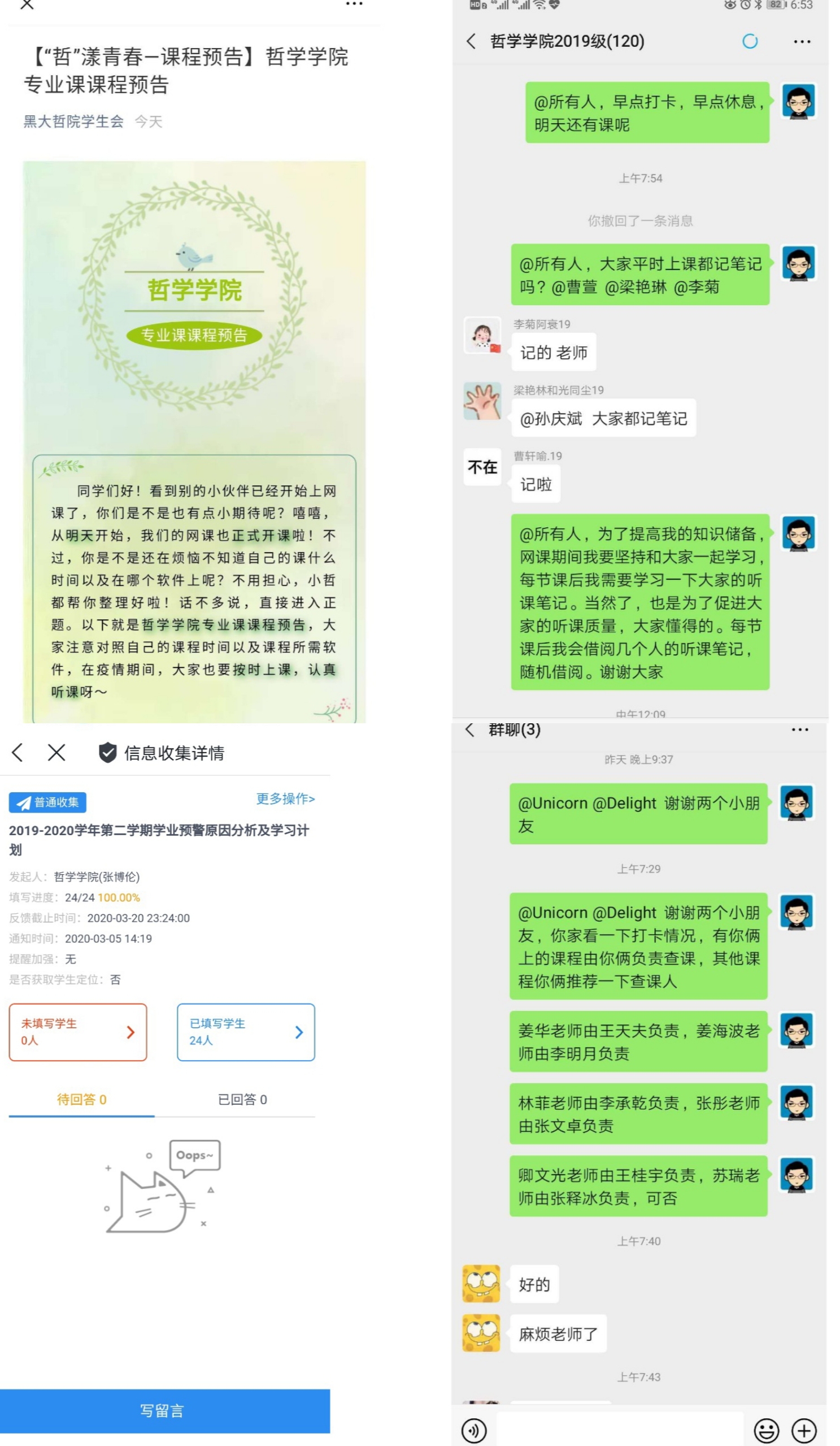 积极运用网络新媒体手段营造浓厚学习氛围,使网络成为开展优良学风创建的重要手段。学院高度重视对学生进行正面激励、教育和引导,通过召开线上年级大会、云班会、辅导员一对一联系沟通督促学生、实行班级干部分班负责制等方式,营造形塑自主学习新学风,确保线上教学无遗漏。学院创新运用第二课堂方式,积极开展“学生党员云党课”、“书香暖心推荐书目活动”,“同心防疫,读’攻‘毒’”活动、“专业课程早知道”等活动,通过生动活泼的线上优良学风创建和宣传活动,持续推动优良学风建设深入发展,有效打造凝聚线上线下的新合力。