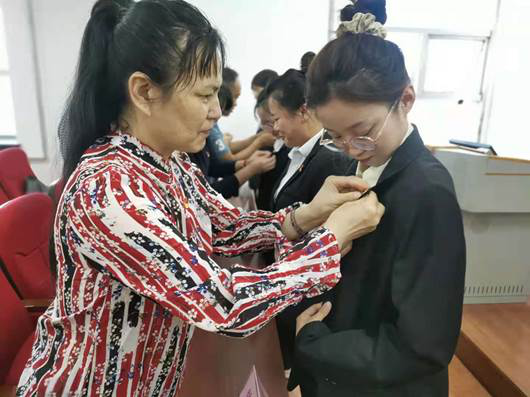 (为新发展党员佩戴党员徽章)