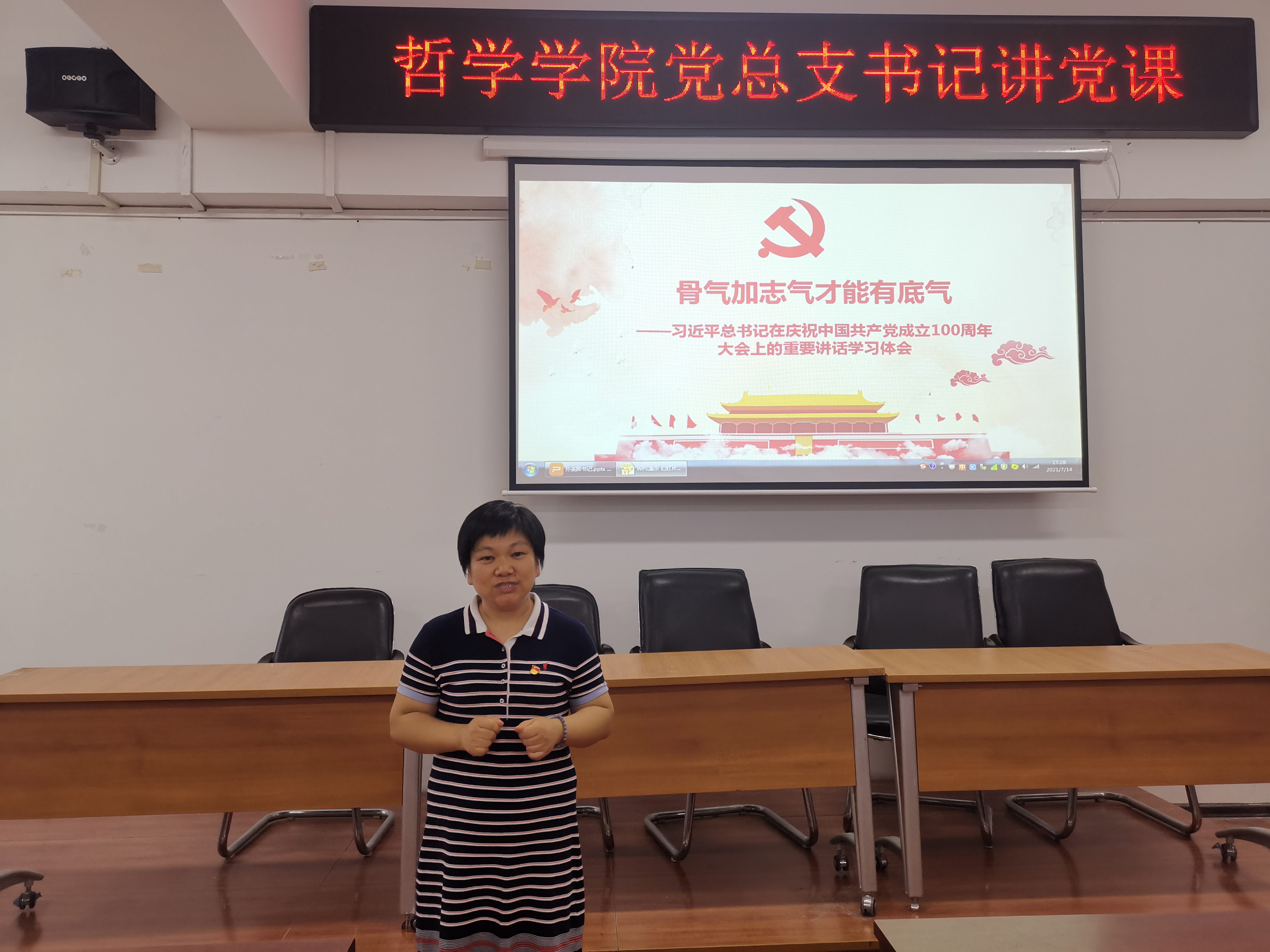 7月14日,学院党总支书记孙美晖面向全体党员作了题为《骨气加志气才能有底气——习近平总书记在庆祝中国共产党成立100周年大会上的重要讲话学习体会》专题党课。她谈到,思前辈筚路蓝缕,栉风沐雨,披荆斩棘,前赴后继,感我辈生于太平,幸逢盛世,接力续程,使命光荣!从南湖一叶红船,南昌一响枪声,井冈一声号角,长征一路播种,抗日一腔赤诚,建国一项伟业,改革一缕春风,小康一段征程,中国共产党领导中国人民用骨气加勇气,打造出中国的底气和硬气!回首过往,我们的党探索前行,带领中华民族走出至暗黑夜;历阅百年,我们的党风华正茂,带领中国人民实现全面小康;展望未来,我们的党意气风发,带领伟大中国奔向强国之梦!