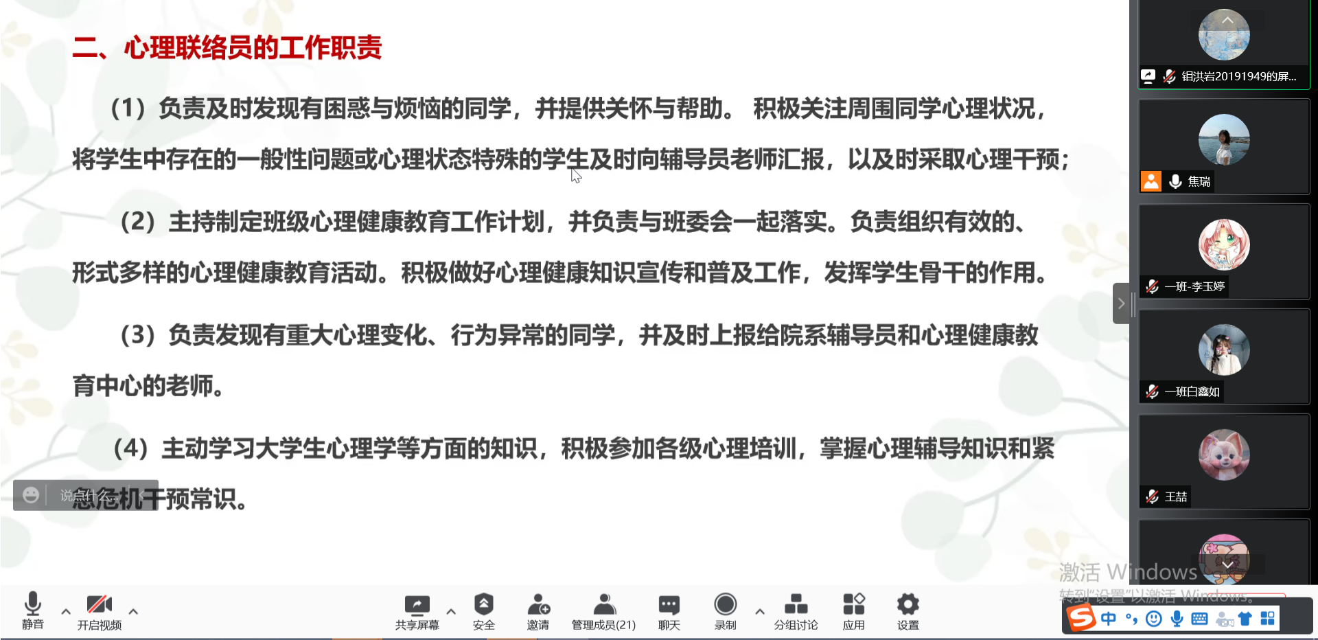首先,由21级新生辅导员焦瑞老师主持会议,焦老师指出:“寝室长同时也肩负着心里联络员的身份,班级团支书也是班级的朋辈心理辅导员,大家的工作非常有意义与重要”。接下来,二级心理辅导站副站长钼洪岩进行讲话。其内容共分为四部分。
