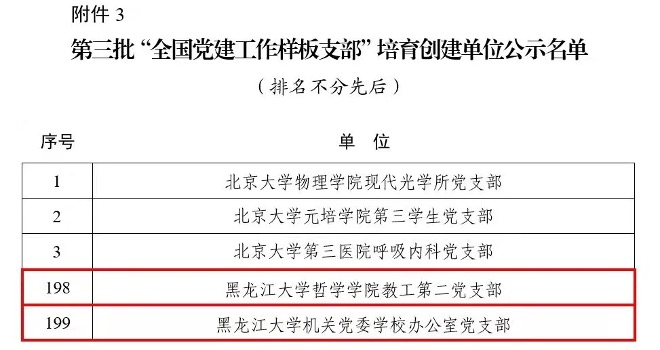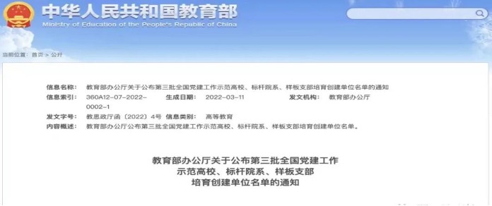 据了解,第三批全国党建工作示范高校、标杆院系、样板支部培育创建单位经省级党委教育工作部门推荐、资格审查、专家推荐、教育部党的建设和全面从严治党工作领导小组成员单位集中审议、结果公示,遴选产生了11个全国党建工作示范高校、100个全国党建工作标杆院系、1000个全国党建工作样板支部培育创建单位。