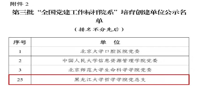 教工第二党支部入选“全国党建工作样板支部”培育创建单位,入选层次和数量均取得了新突破。截至目前,我校已累计入选“全国党建工作标杆院系” 1个、“全国党建工作样板支部” 4个、“全国高校百名研究生党员标兵”1名。