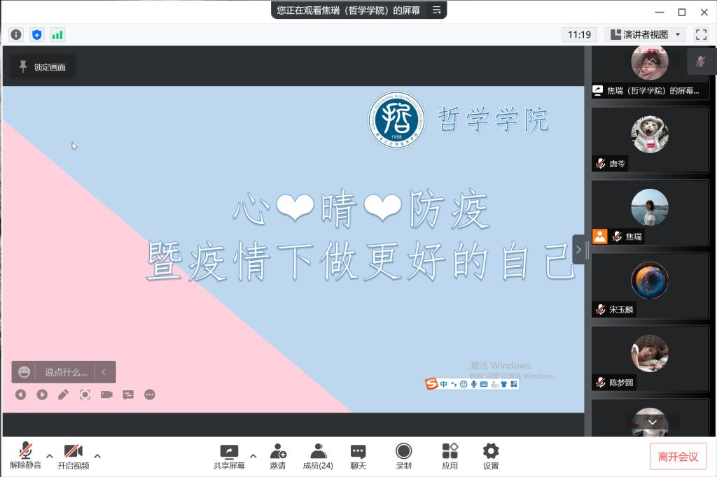 欢声笑语,心晴氛暖。焦老师讲述了疫情防控下开展心理健康教育的意义,并开启了活动的第一个环节“一起来做拍拍操”。辅导员焦瑞老师带领大家共同做拍拍操,通过简单轻快的拍拍动作缓解疫情下同学们紧张疲劳的心理压力,让同学们快速融入到了活动中。