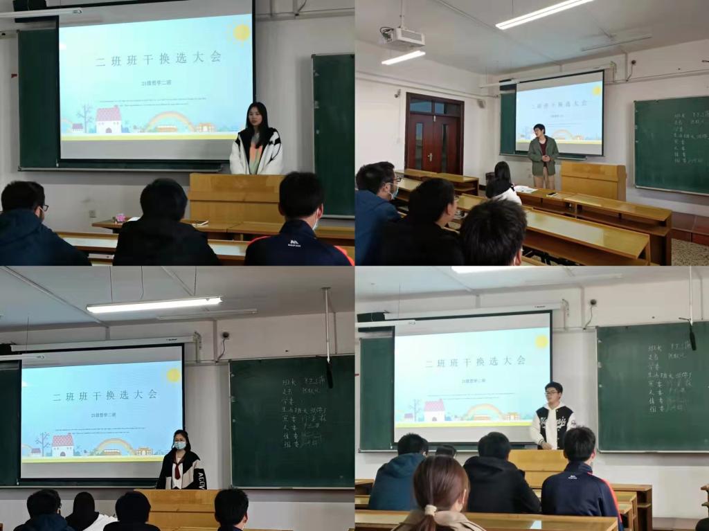 首先辅导员焦瑞老师开始班会,讲解了班干换选细则,提出作为合格班干的要求:班干不仅要学习成绩优秀,而且更要有一定的组织能力与管理能力,有责任心、奉献意识、大局意识。其次焦老师鼓励大家积极参与竞选班干部,担任班干更是一次能够提升自己的沟通能力、协调能力,磨炼自我意志、收获真挚友谊的宝贵经历。