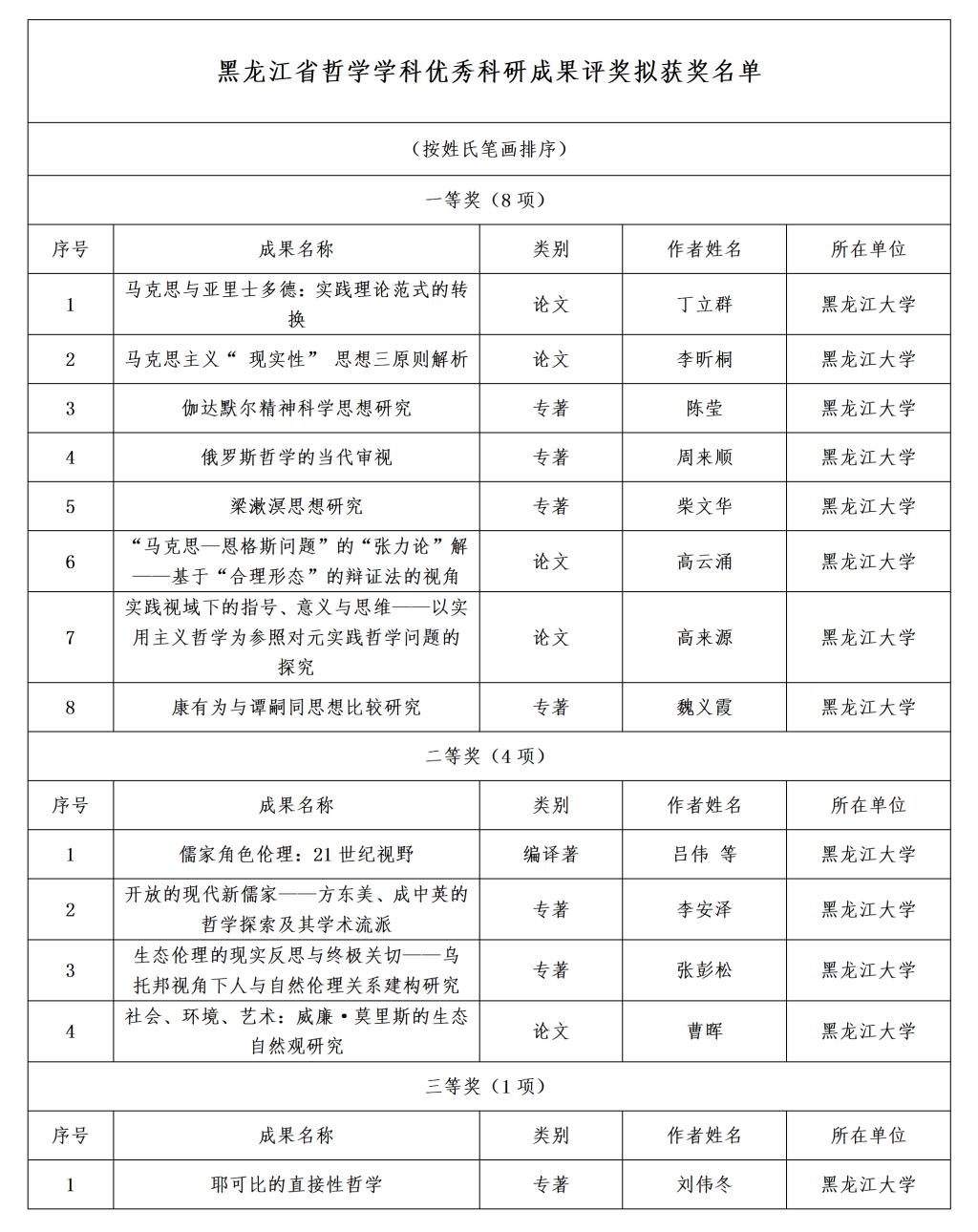 依据《黑龙江省学科优秀科研成果评奖实施细则》的规定,按照有关工作方案的安排,全省哲学学科优秀科研成果奖申报及评审工作已完成,共评选出获奖成果50项。