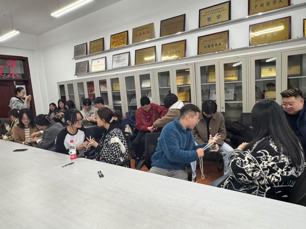 在游戏体验环节,大家共同参与传统民俗游戏——翻花绳,一根小小的绳子在手中翻转飞舞,勾起了大家的童年回忆。通过这种轻松有趣的方式,大家深刻体会到了传统民俗游戏所蕴含的团结协作精神,以及中华民族传统文化的博大精深。