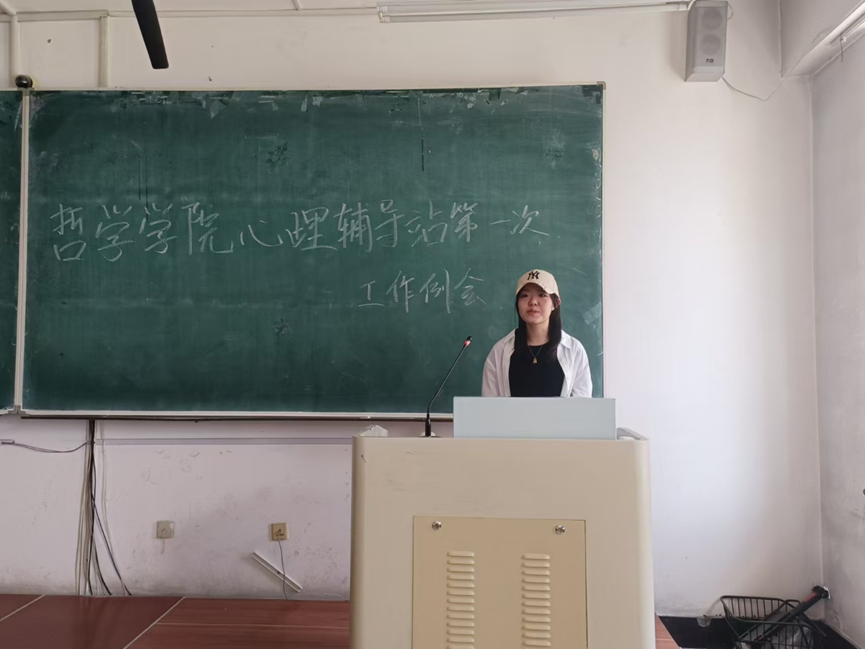 会议开始,二级心理辅导站副站长曹旭睿进行发言,提及二级心理辅导站的重要作用,强调要加强学校—学院—学生的重要关系,认为心理站干事应从学院二级心理辅导站为基,完善完成学校各活动安排,并且给哲学院各学生健康的心理活动体验,提醒各干事的职能作用,加强心理站与学生之间的联系。