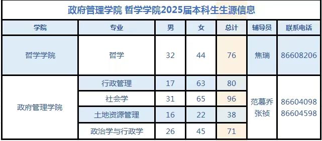学院拥有公共管理学、政治学、社会学3个系,行政管理、土地资源管理、政治学与行政学、社会学4个本科专业;拥有公共管理一级学科博士学位授予权、公共管理学博士后科研流动站、公共管理一级学科硕士学位授予权、公共管理硕士专业学位授予权、政治学一级学科硕士学位授予权、社会学一级学科硕士学位授予权、社会工作硕士专业学位授予权;拥有省部级研究基地、人才培训基地5个。