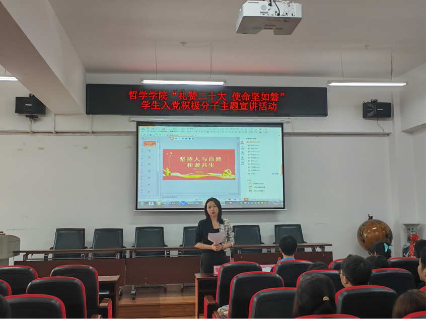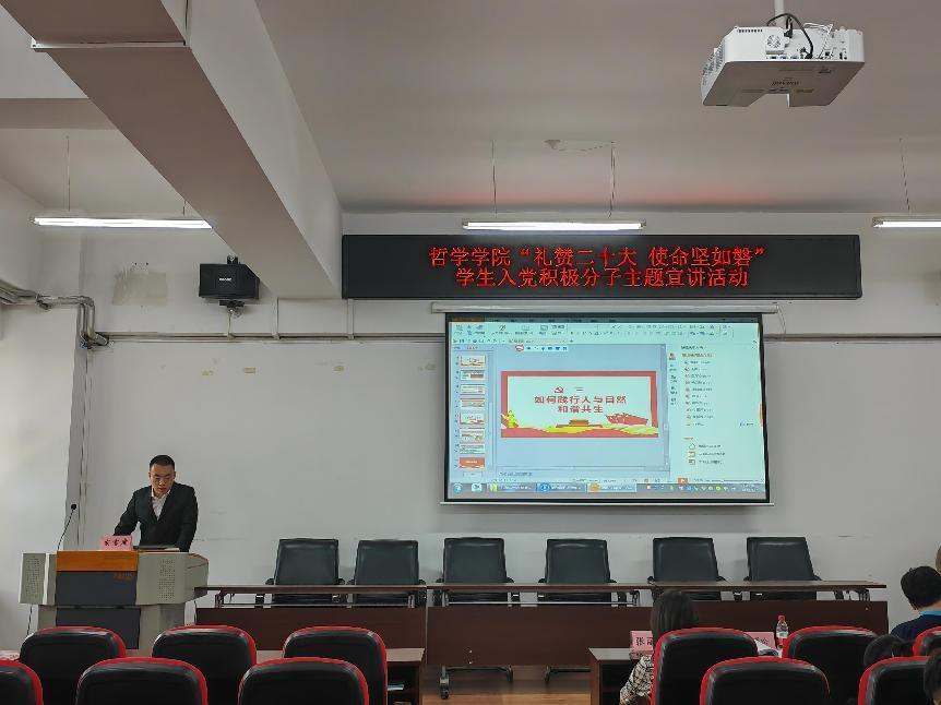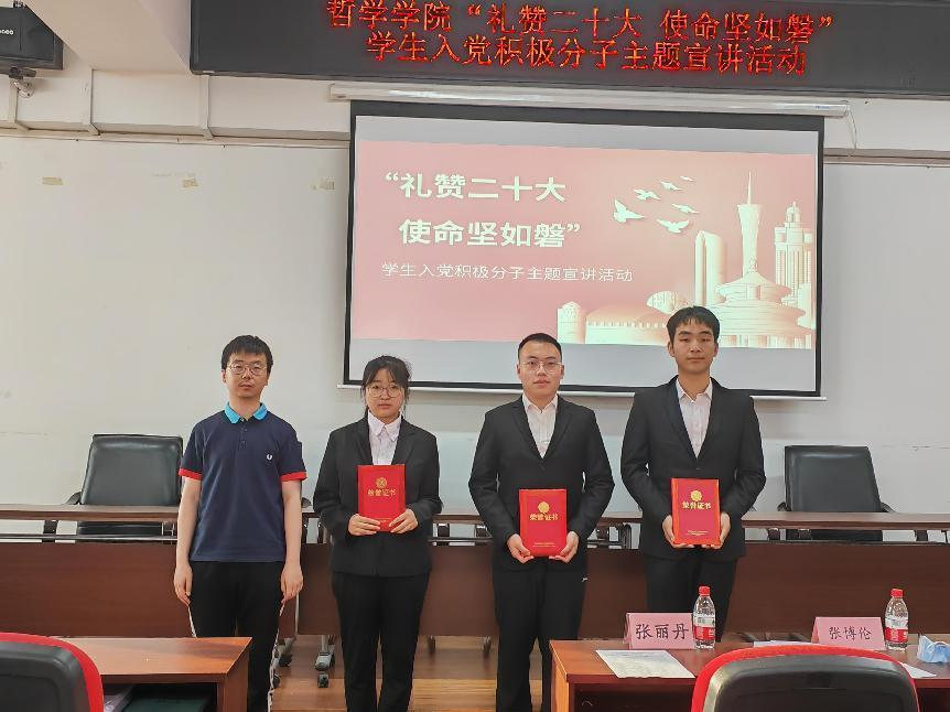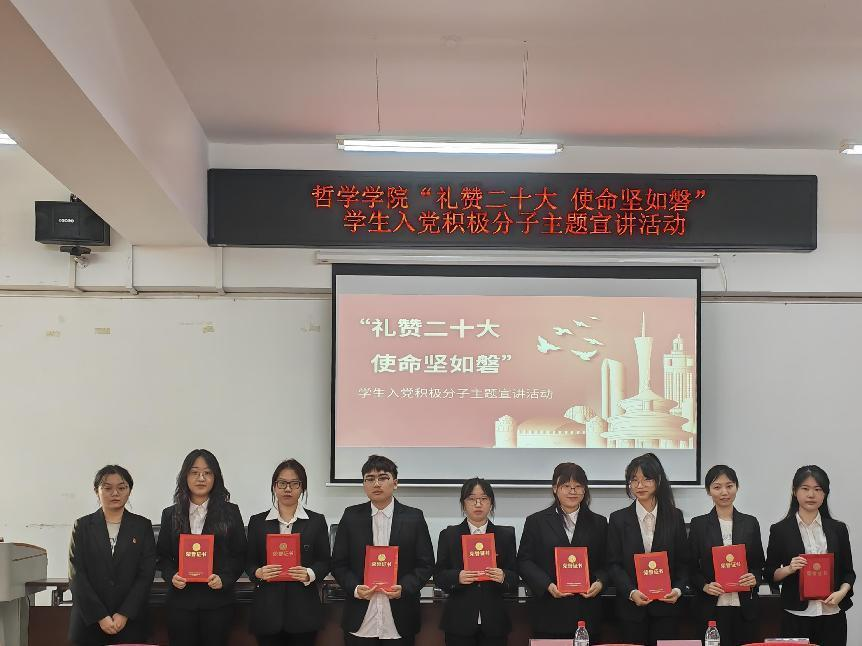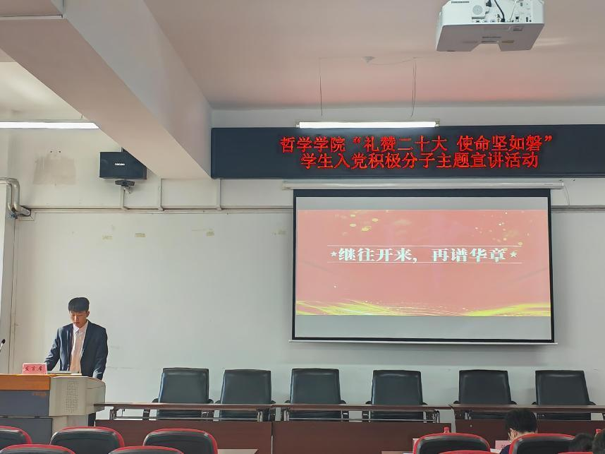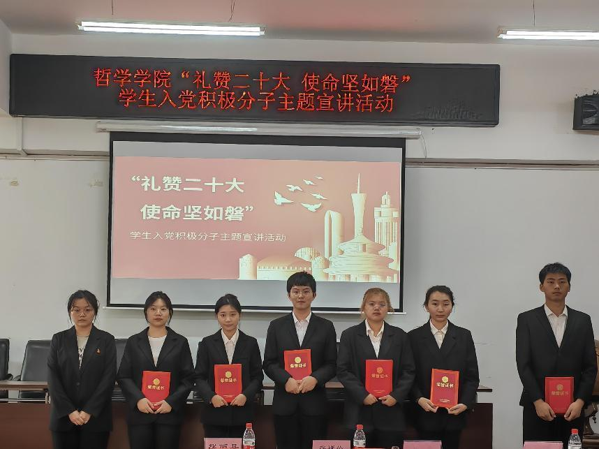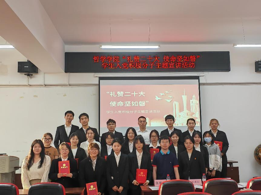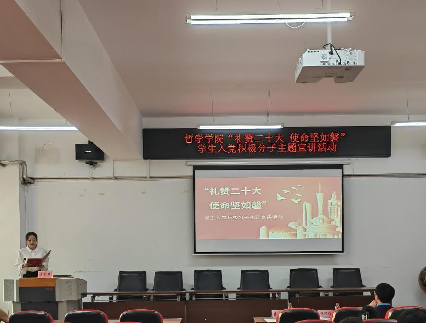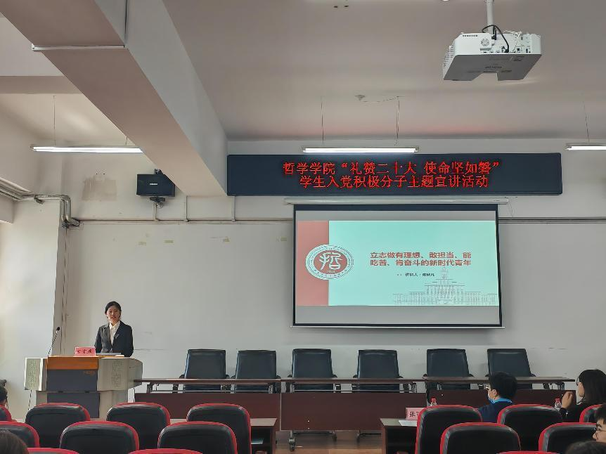为深入学习贯彻党的二十大精神、学习习近平新时代中国特色社会主义思想,提高入党积极分子的思想觉悟,加强其对党的认识,果冻传媒 于6月7日开展“礼赞二十大 使命坚如磐”学生入党积极分子主题宣讲活动。果冻传媒 党总支副书记张丽丹、2020级辅导员张博伦、2021和2022级辅导员焦瑞出席,第十一届果冻传媒 学生会主席李亚男出席,各年级学生入党积极分子参加此次活动,2020级学生吕永航主持活动。